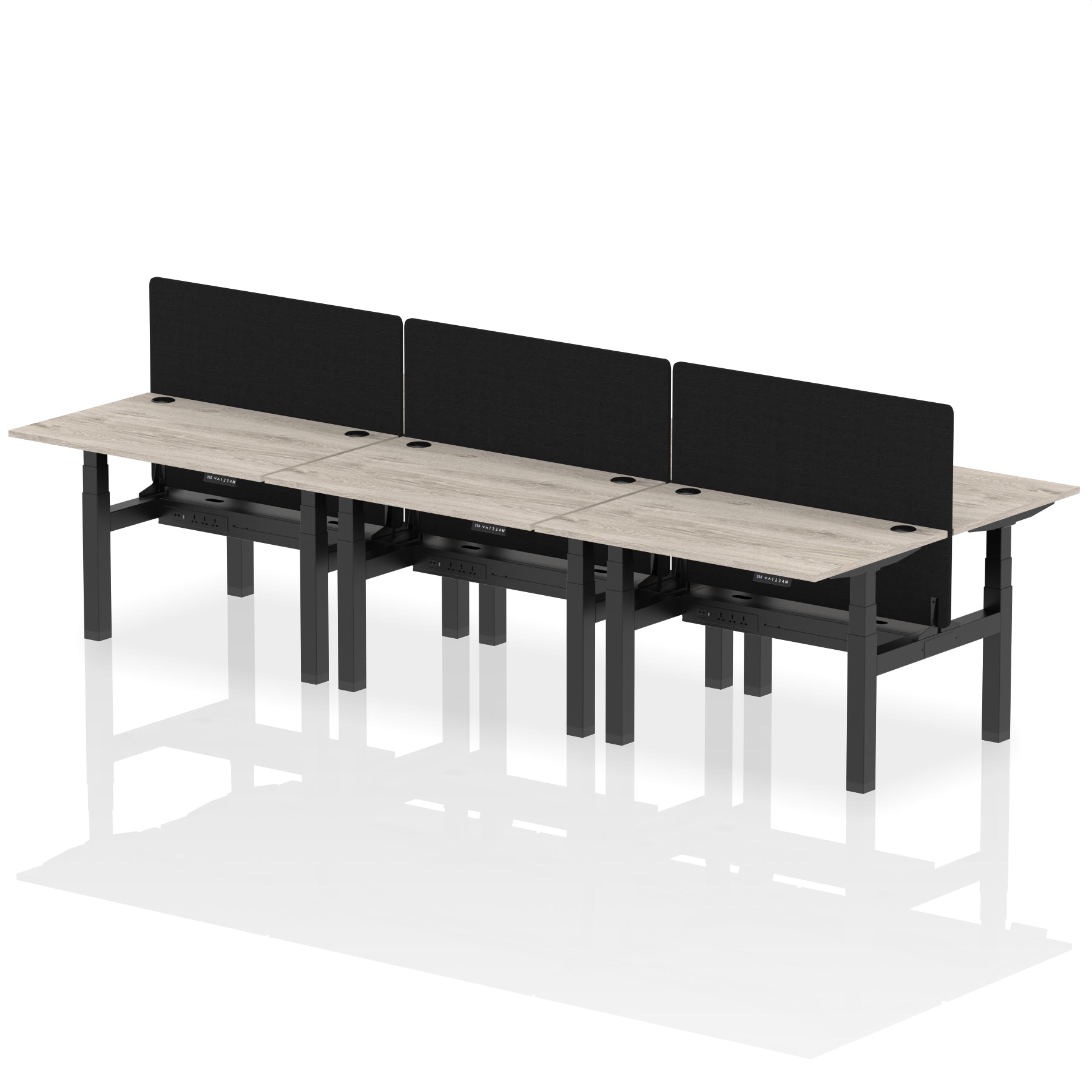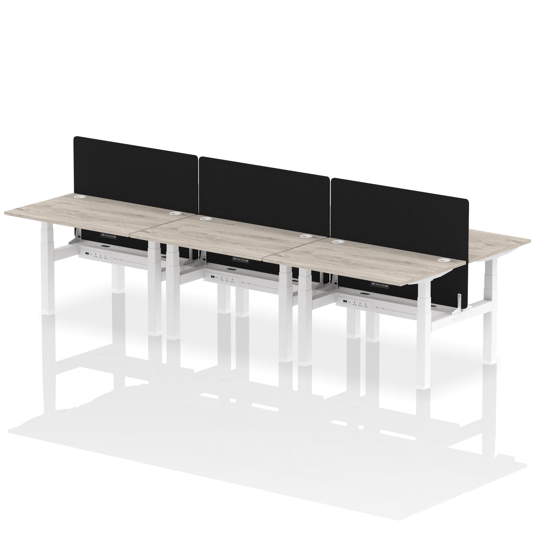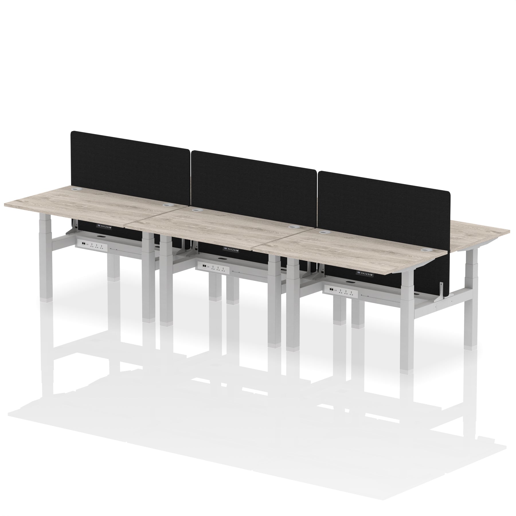 Elevate your office with the Air Back-to-Back Height Adjustable Desk for six, a blend of ergonomics and connectivity. Each desk includes two Ethernet ports, a USB and USB-C port, and three UK plugs, complemented by integrated cable ports for a clean setup. The addition of a dividing screen per duo offers privacy and focus. This desk is a perfect match for professionals seeking a tidy, tech-friendly, and adaptable workspace.