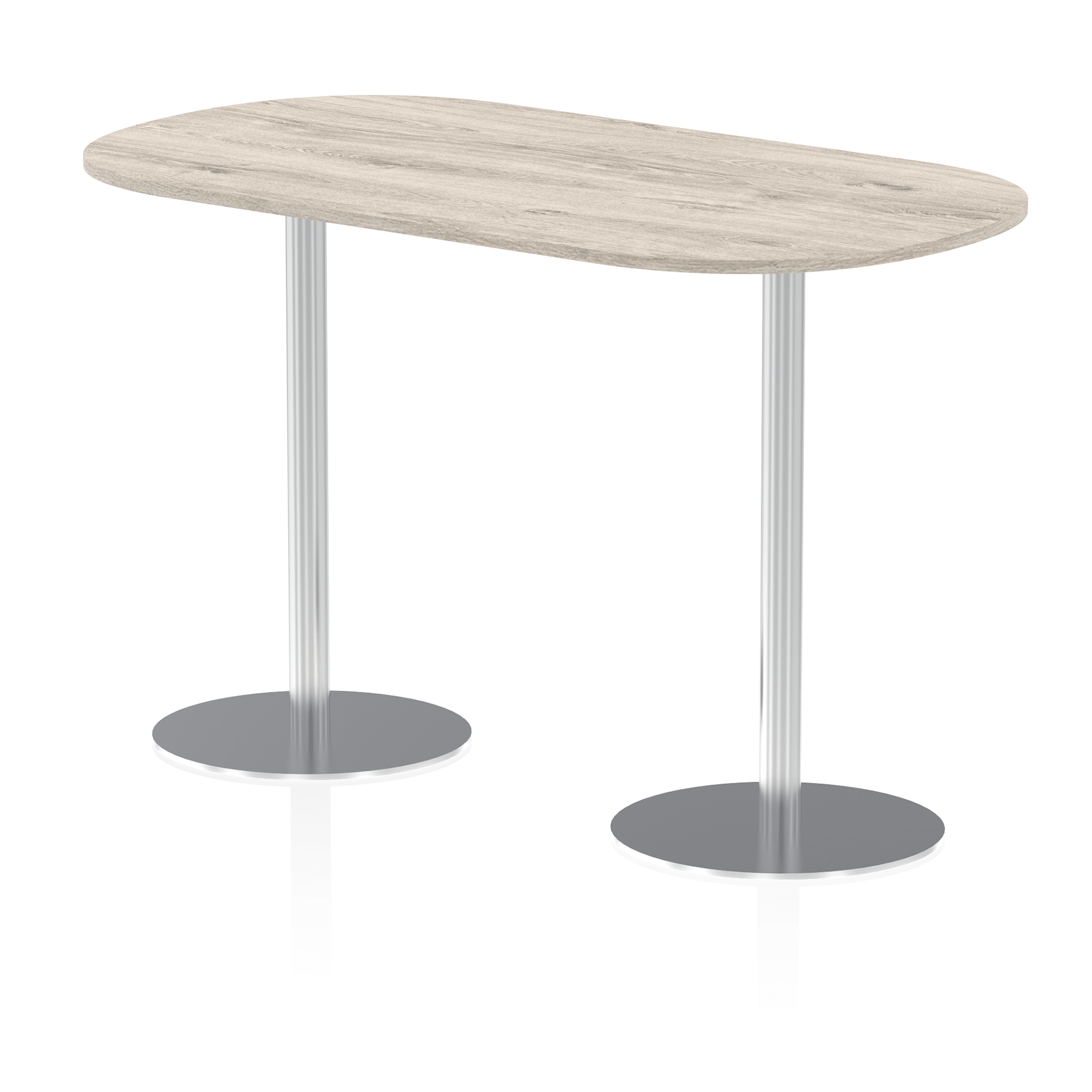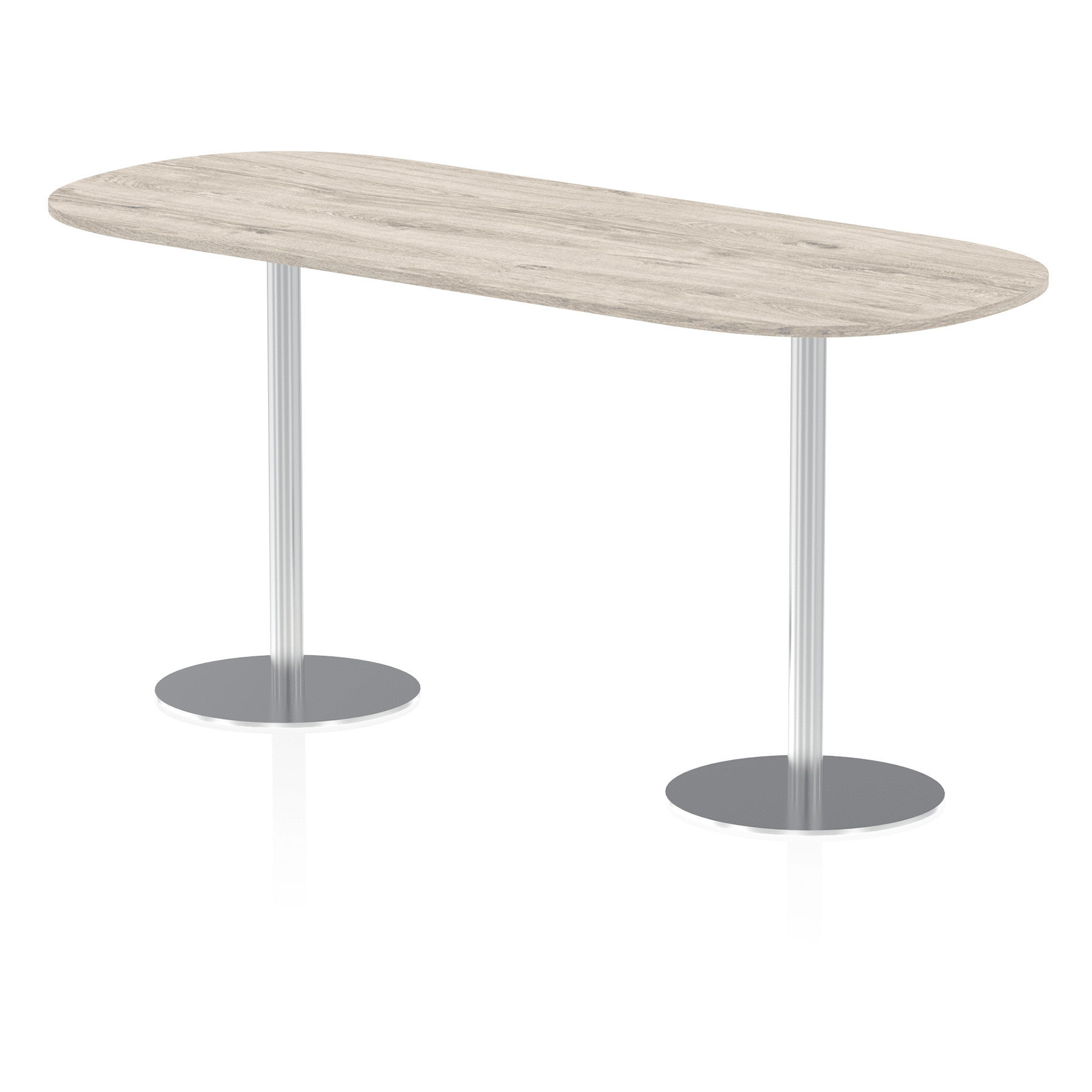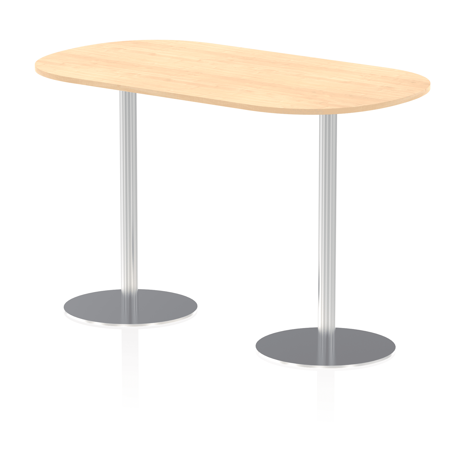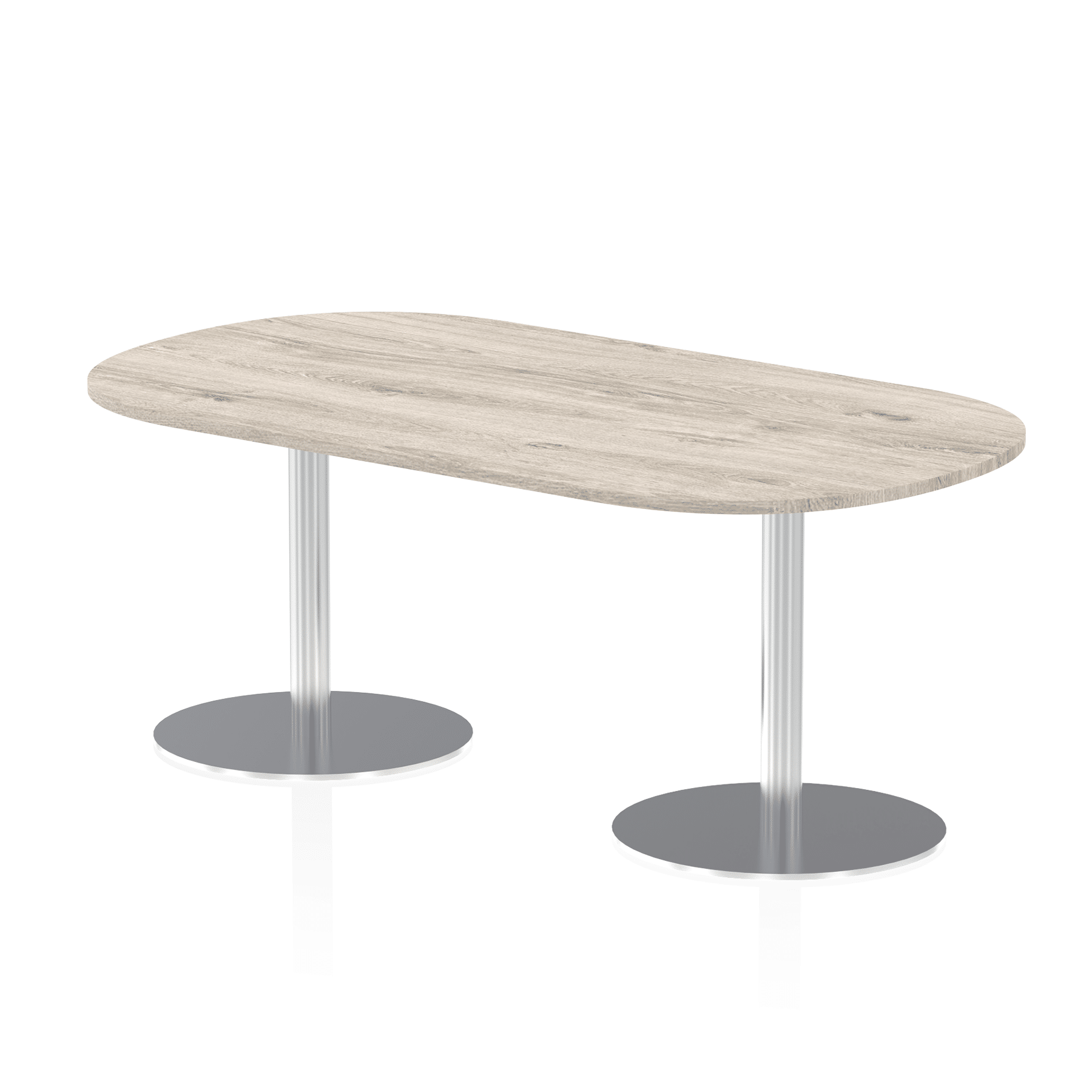 25mm thick desk top profile | Dual, brushed stainless steel effect circular base (580mm diameter) | Brushed stainless steel pillars (76mm diameter) | Weighted base provides stability | Two part bolted frame system