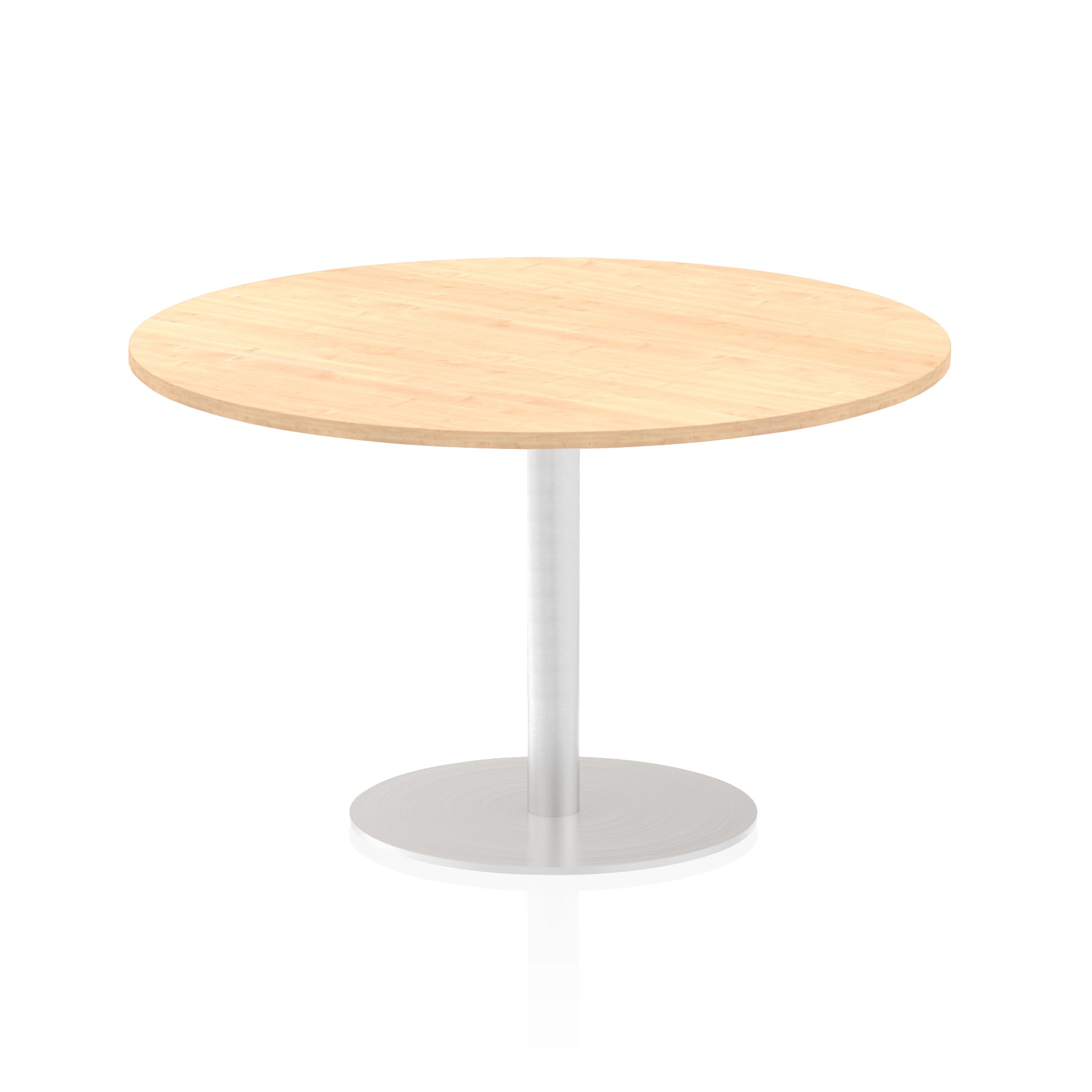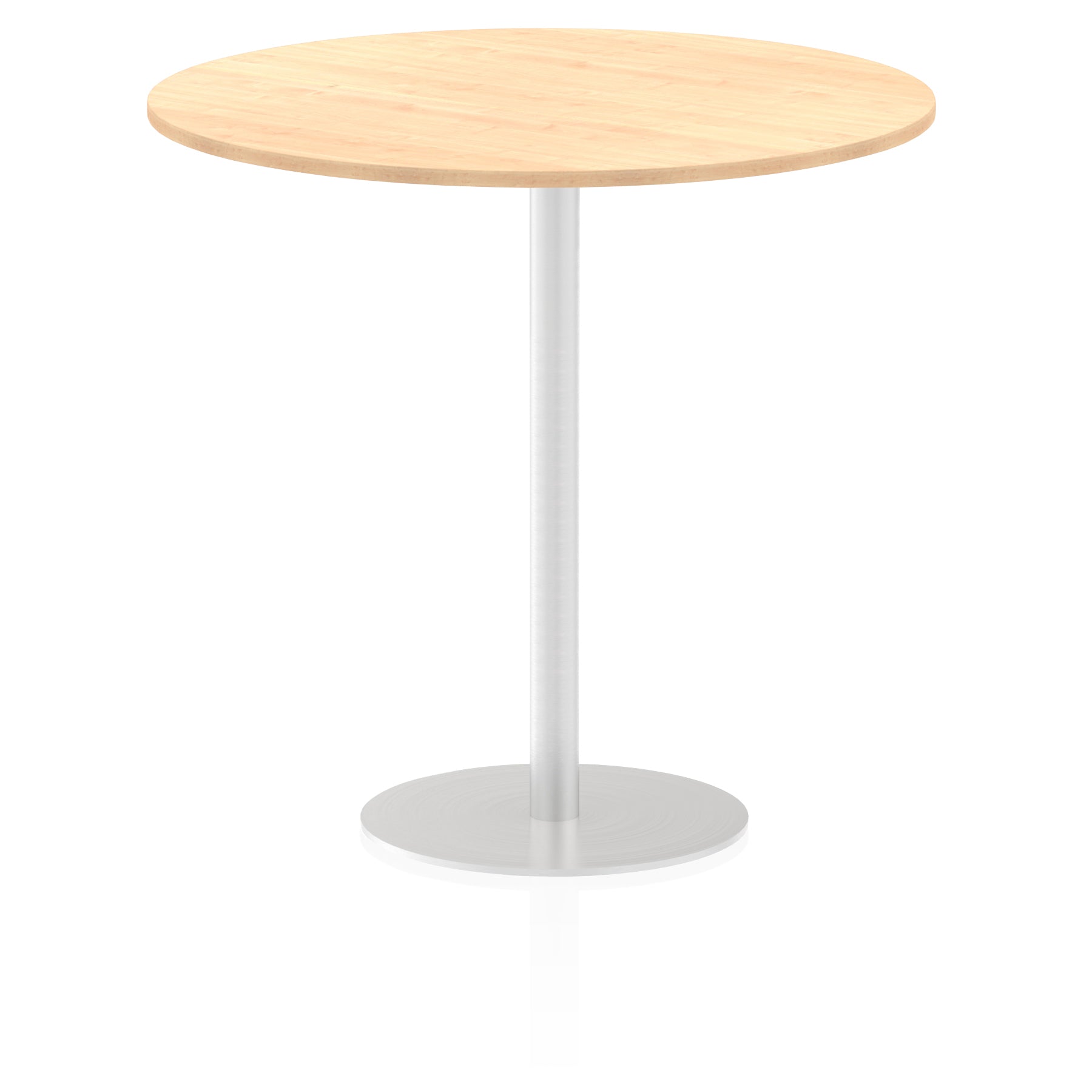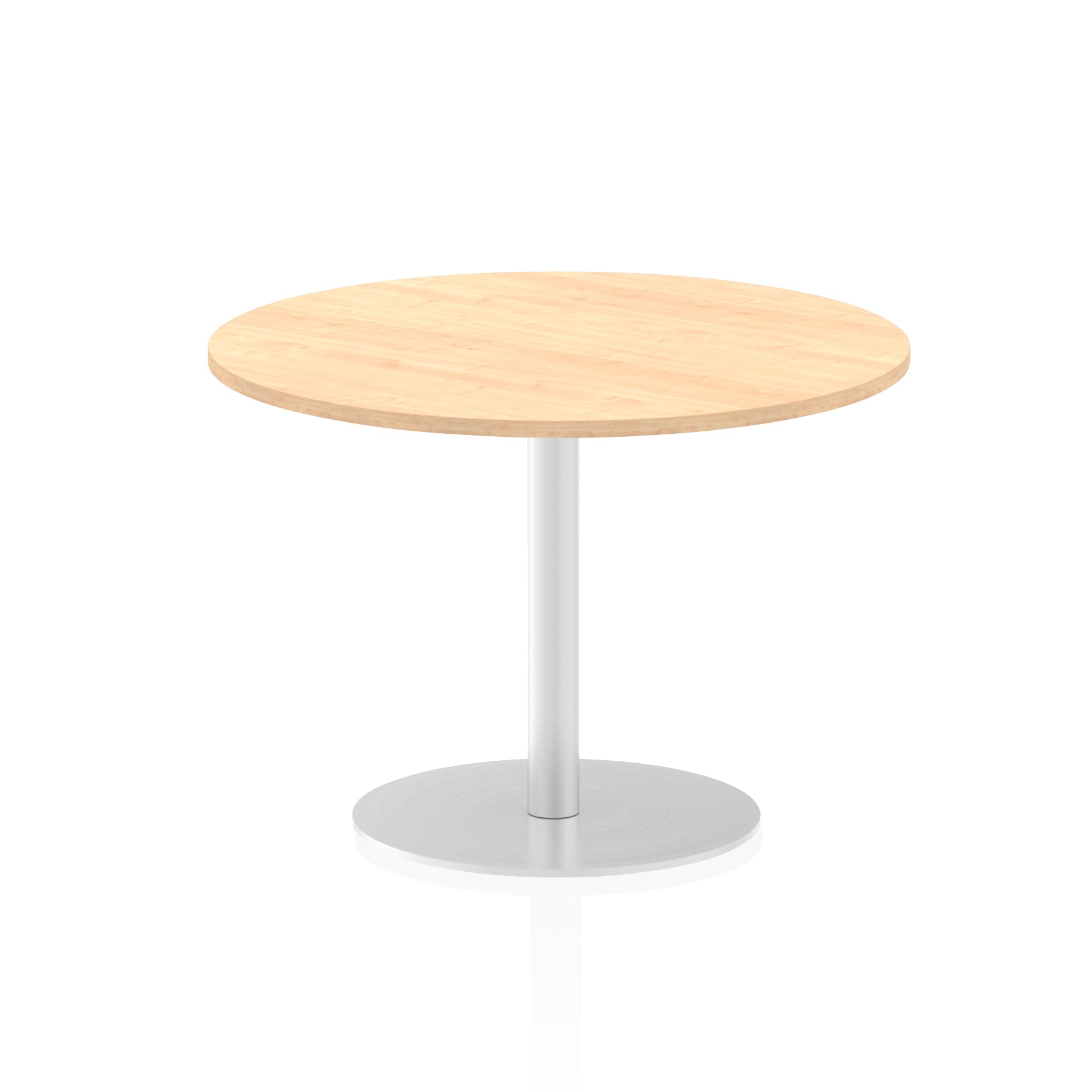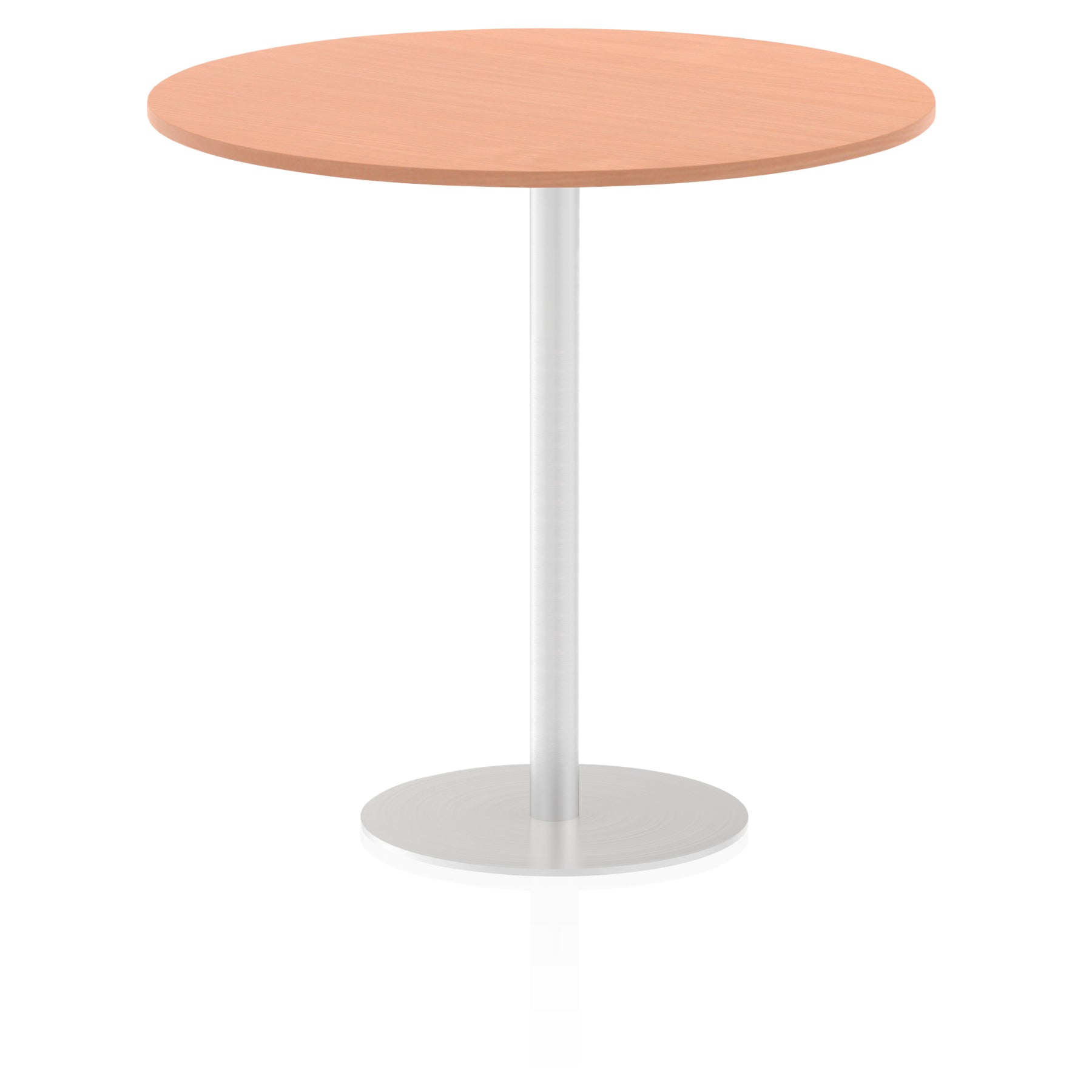 25mm thick desk top profile | Brushed stainless steel effect circular base (580mm diameter) | Brushed stainless steel pillars (76mm diameter) | Weighted base provides stability | Two part bolted frame system