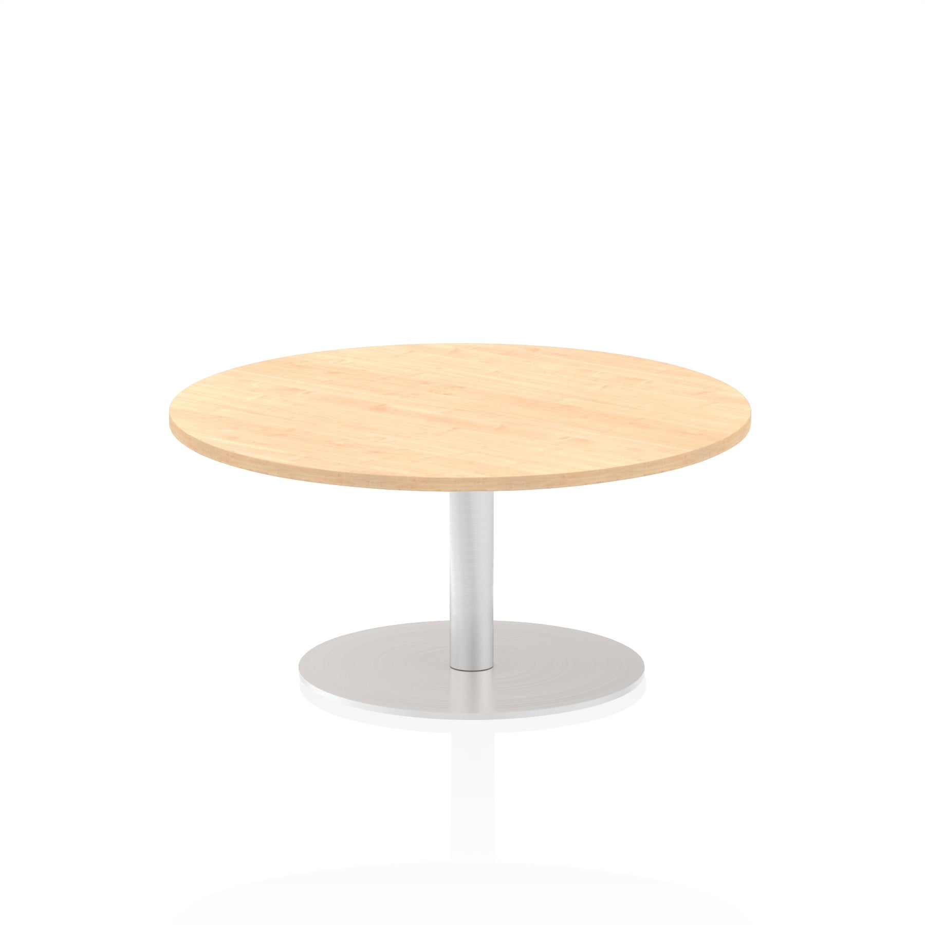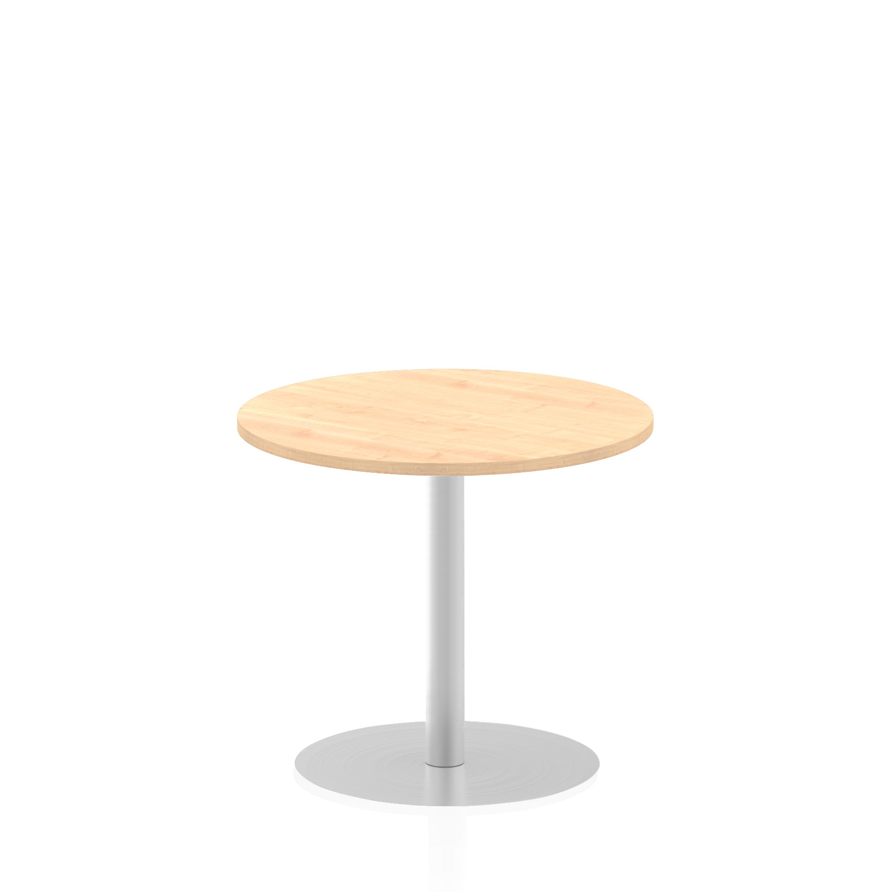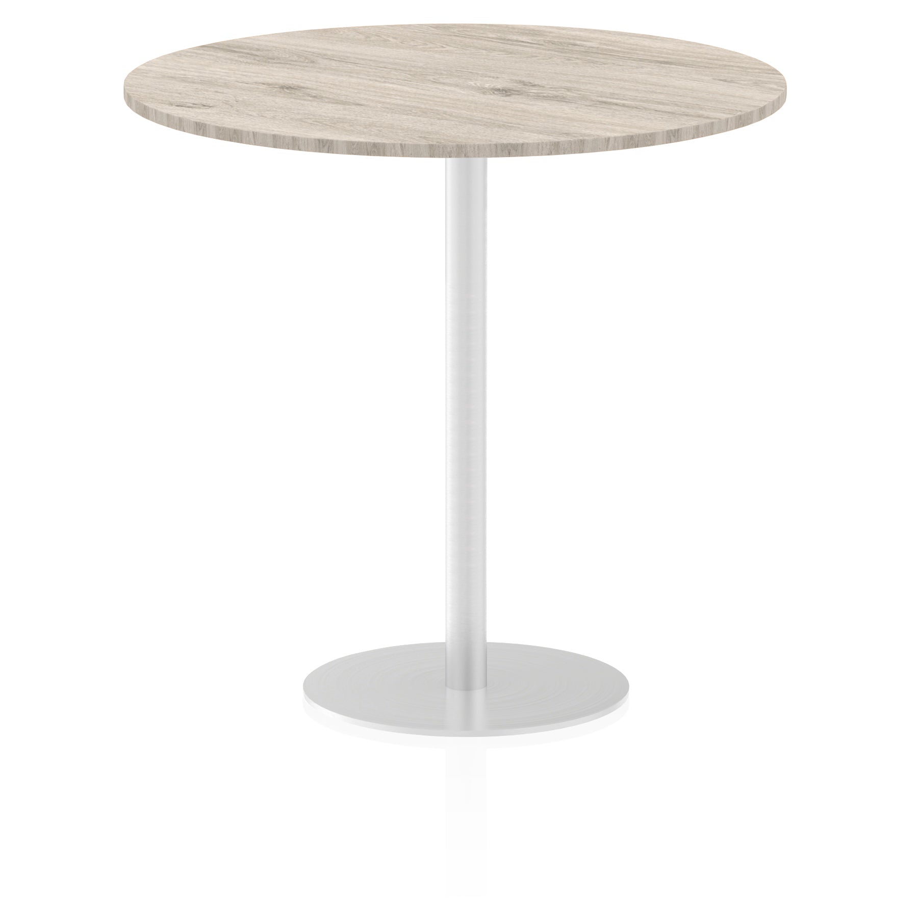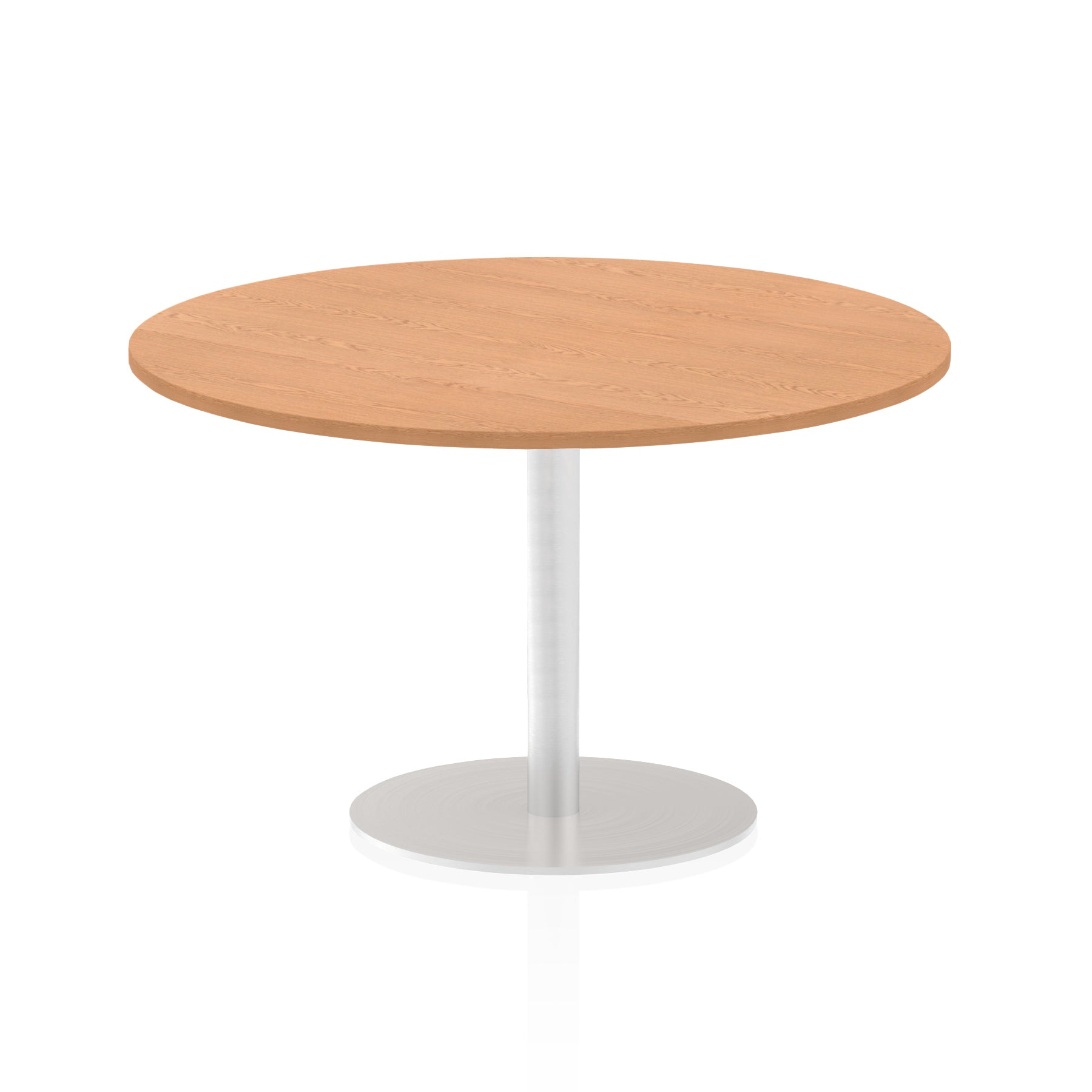 25mm thick desk top profile | Brushed stainless steel effect circular base (580mm diameter) | Brushed stainless steel pillars (76mm diameter) | Weighted base provides stability | Two part bolted frame system