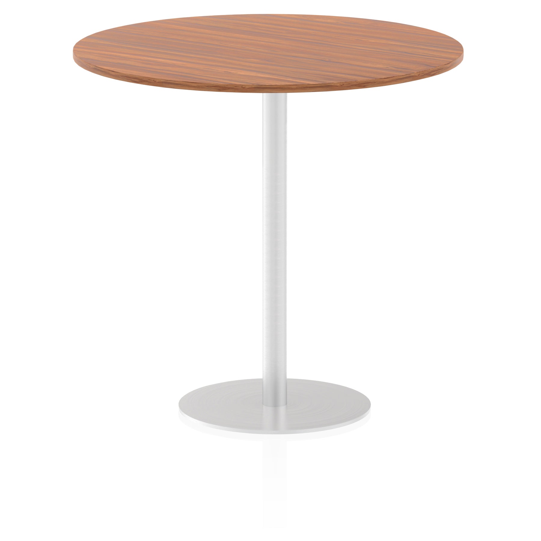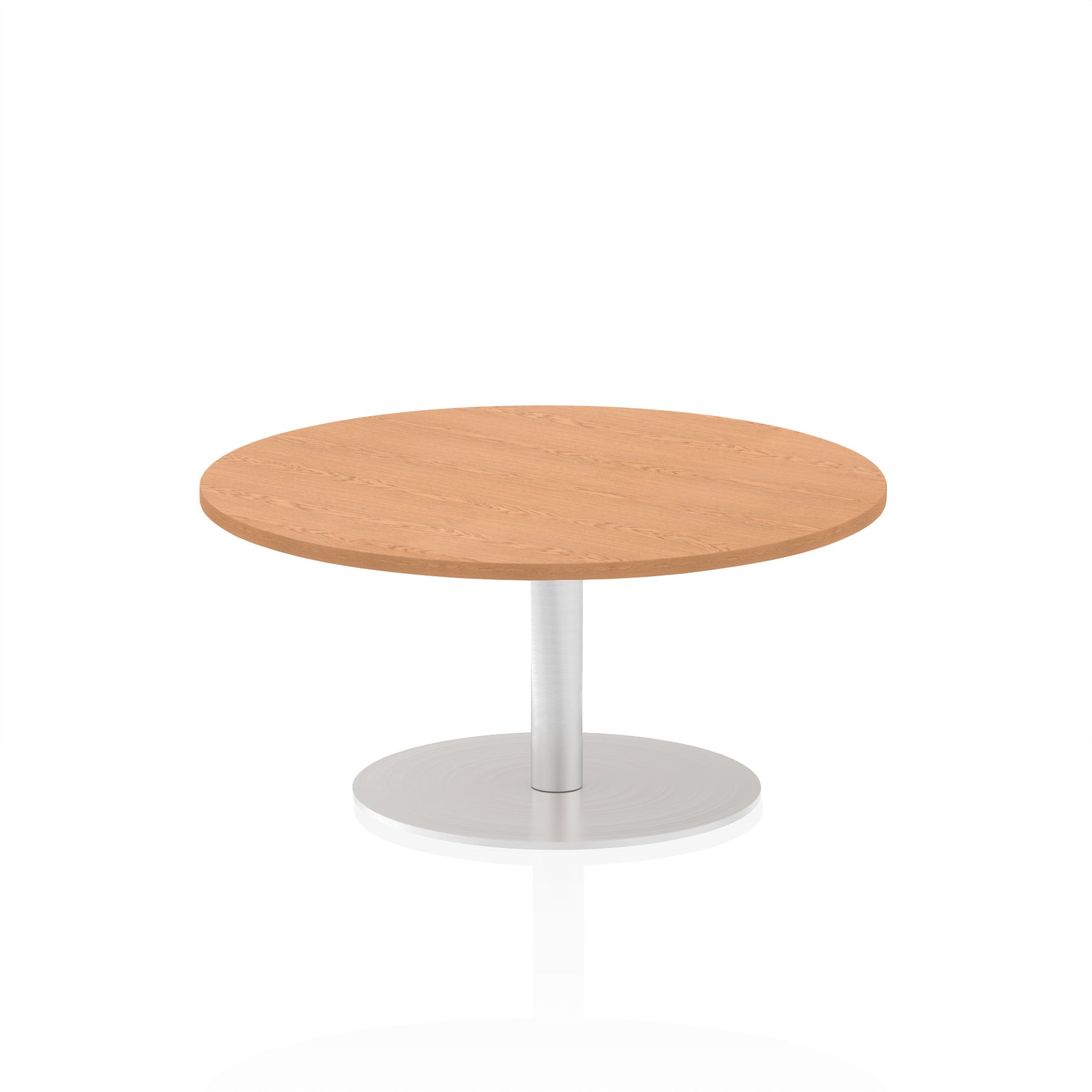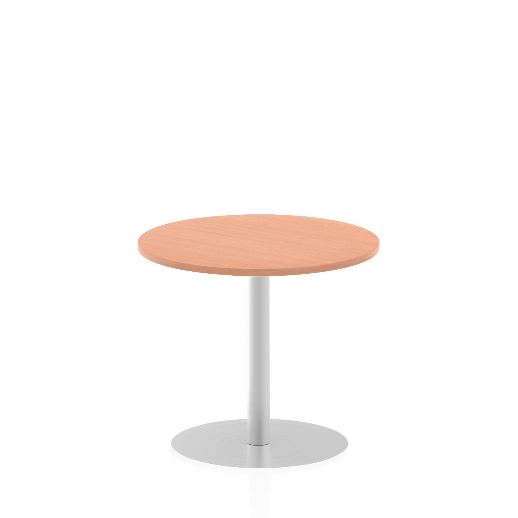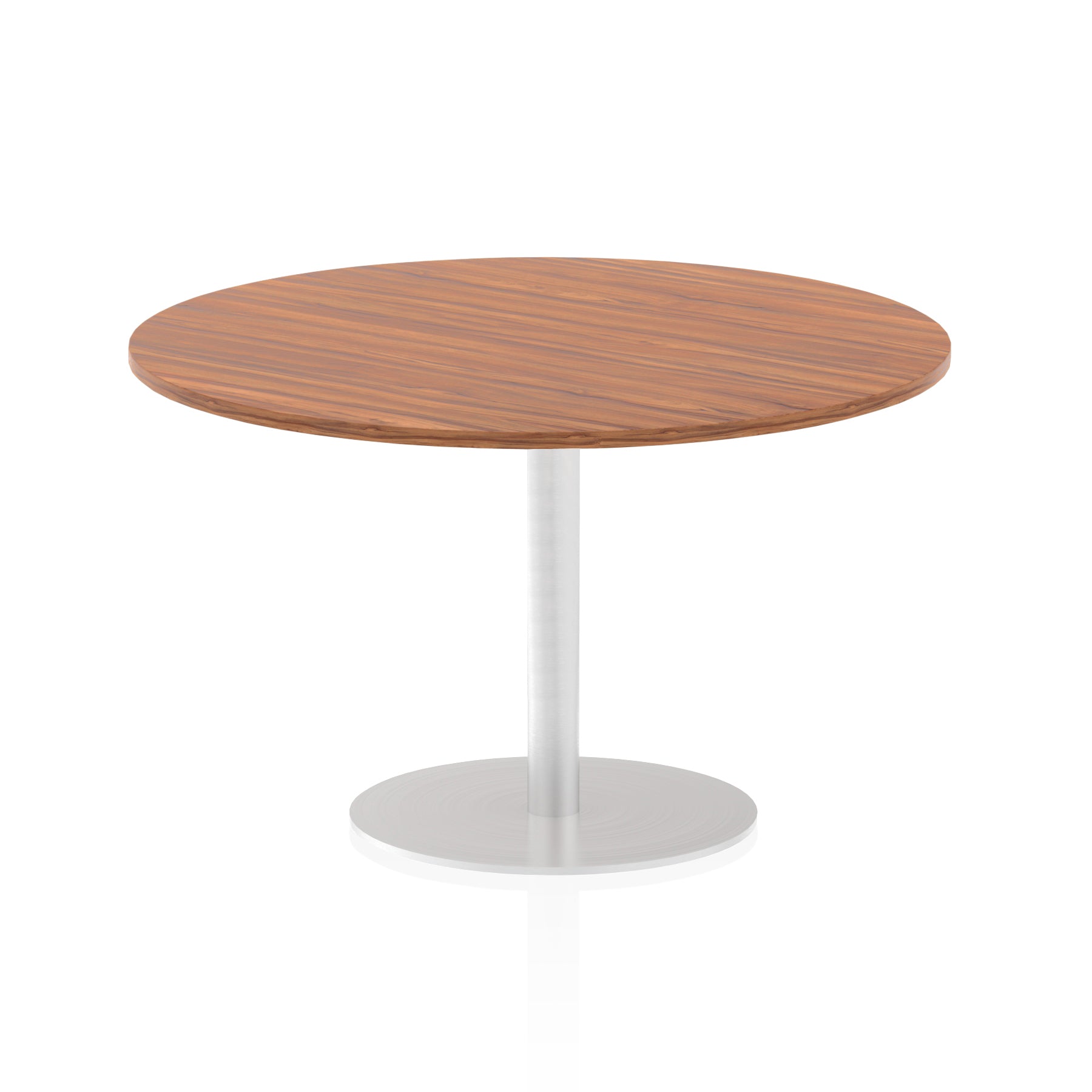25mm thick desk top profile | Brushed stainless steel effect circular base (580mm diameter) | Brushed stainless steel pillars (76mm diameter) | Weighted base provides stability | Two part bolted frame system