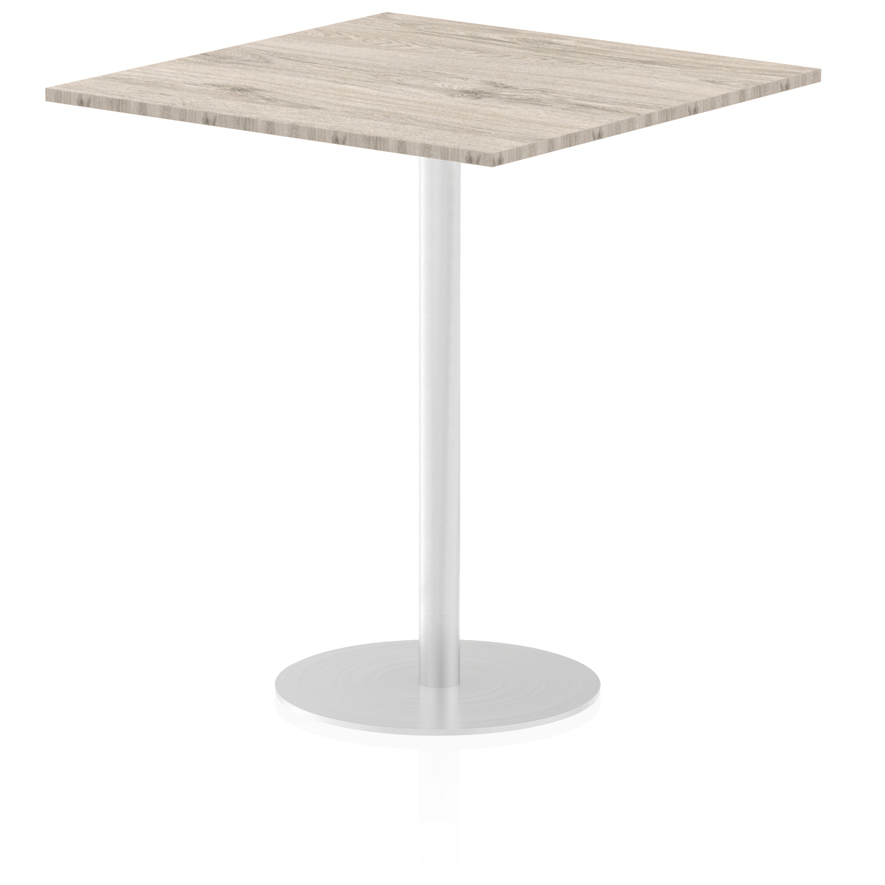 25mm thick desk top profile | Brushed stainless steel effect circular base (580mm diameter) | Brushed stainless steel pillars (76mm diameter) | Weighted base provides stability | Two part bolted frame system