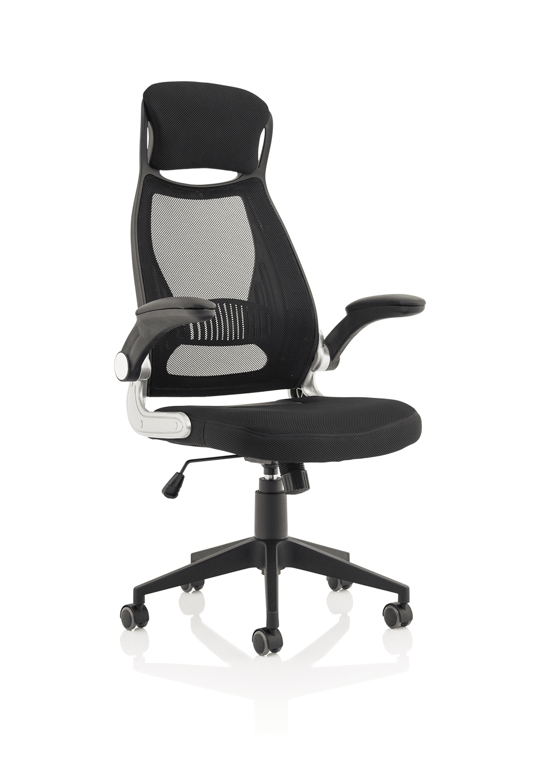• Striking mesh back, airmesh seat design • Single lever rock and lock mechanism • Flip back arms for closer at desk work • Lumbar support pressure pad • Tension controlled tilt • Pyramid base • Generous airmesh headrest • Silver accented armature styling • Padded armrests