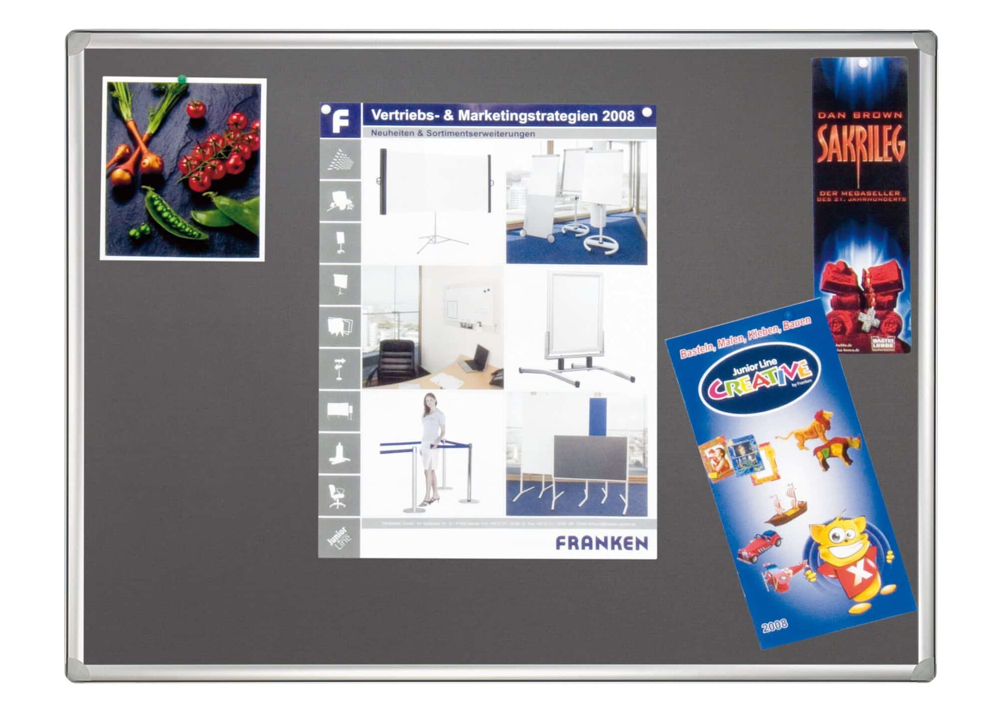 • Franken Felt Notice Board proline • Sizes: 60 x 90cm or 90 x 120 cm • Colours: Blue or Grey • Proline is an innovative range of high quality products that are not only easy to assemble but are functional, versatile, and great to work with • Sturdy construction with 24mm anodised aluminium frame and strong sheet metal backing, standard even in the smallest sizes • Easy to mount, the board is safely secured to the wall using a wall mounting rail (included in packaging) instead of usual corner fixings • The specially designed Proline frame allows the user to attach and remove the board from the wall rail with no tools required • The board can be easily removed from the wall and switched from portrait to landscape format with no effort • When used in combination with Franken Proline stands (sold separately), these boards can be used as room dividers, training boards, partition walls, making them the most versatile boards in the market!